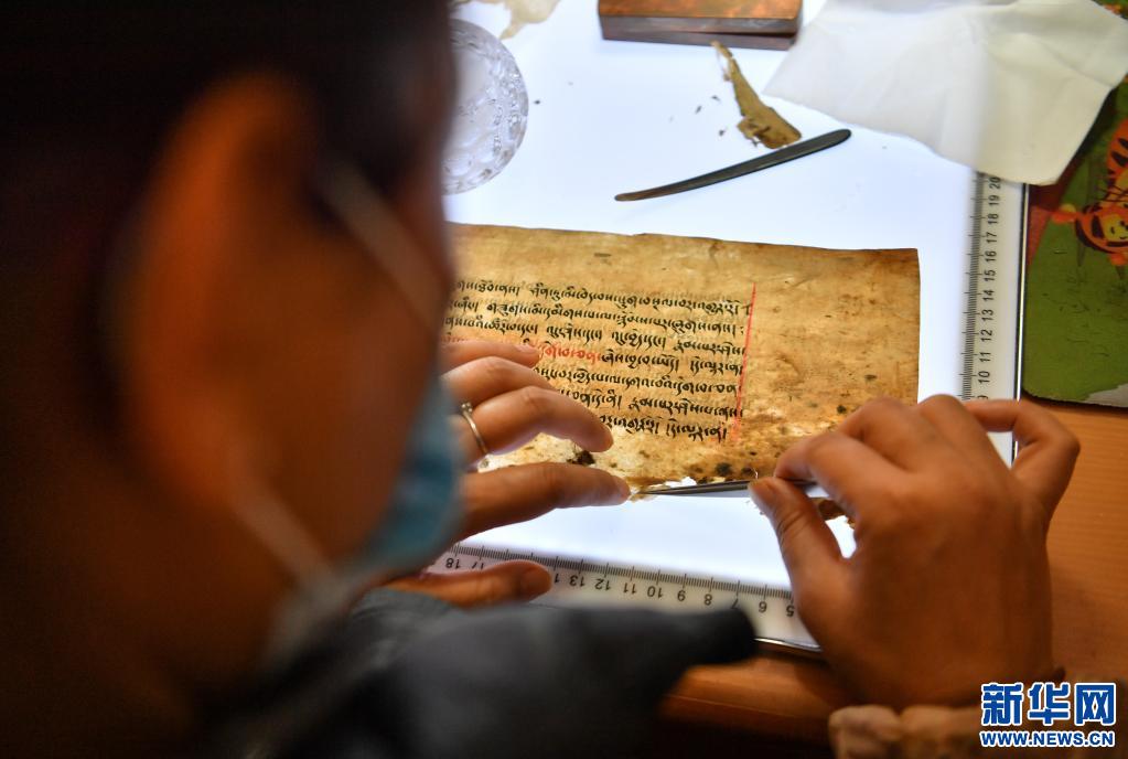 央拉正在修復一葉瀕危藏文古籍。(資料照片 晉美多吉攝)