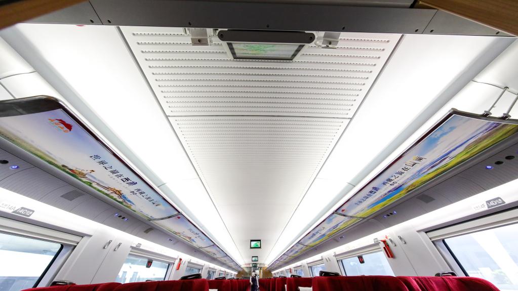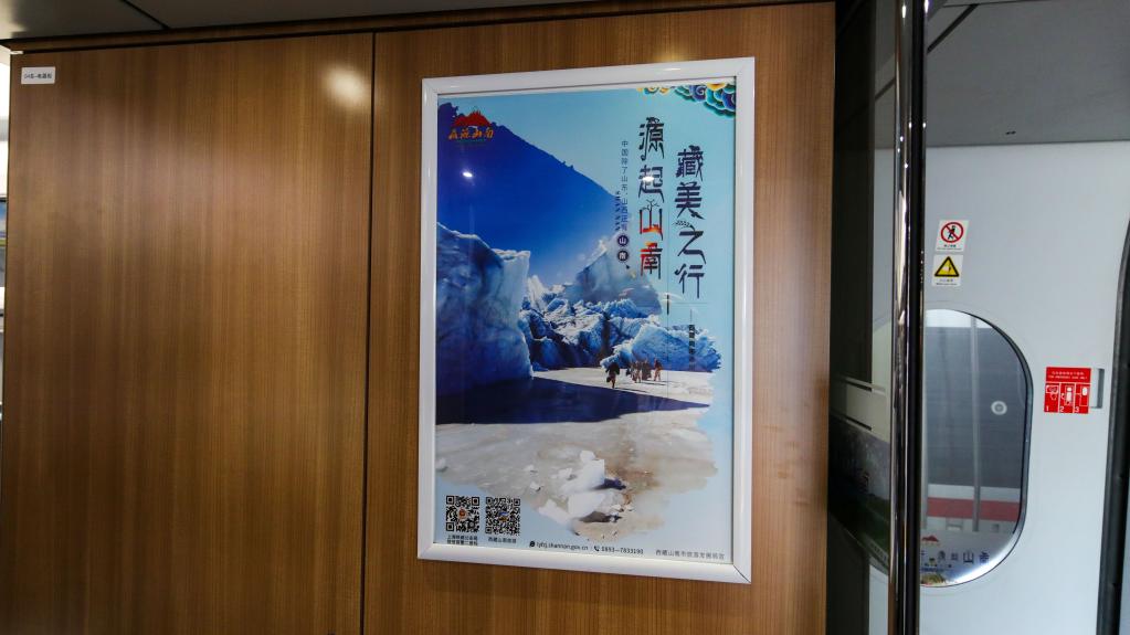 從站臺開始,醒目的車身外彩貼盡入乘客眼中,由此,山南文化旅游的元素就將伴隨乘客的整段旅程。全列車廂,雍布拉康、昌珠古寺、桑耶古鎮、羊卓雍措等旅游目的地與“藏美之行 源起山南”“世界之巔在西藏 西藏之源在山南”等旅游口號互相輝映,將山南歷史文化與盛景濃縮其中,呈現在旅客面前,讓大家近距離感受山南迷人的美景和悠遠的歷史。