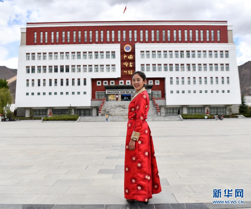 拉增在西藏大學圖書館前留影(5月7日攝)。新華社記者 晉美多吉 攝