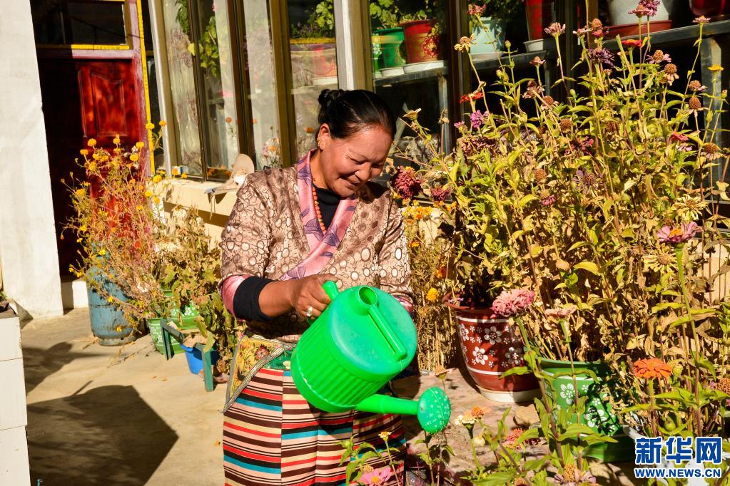 阿里地區(qū)札達(dá)縣札布讓村村民金珠德吉在院子里澆花。(2020年10月16日 攝 新華社記者 田金文 攝)