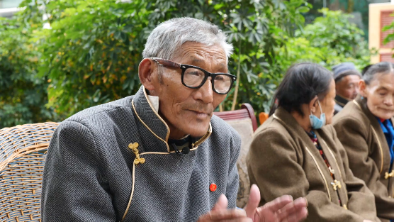 阿里地區(qū)老人護(hù)理院老人 拉松(藏語(yǔ)):護(hù)理員們經(jīng)常給我們洗頭、洗澡、剪指甲,就像對(duì)待自己的親生父母一樣照顧我們,不嫌臟。好吃好喝都有,平時(shí)還可以跟其他老人一起玩玩骰子、打打撲克,很開心、很快樂,這都是國(guó)家的恩惠。