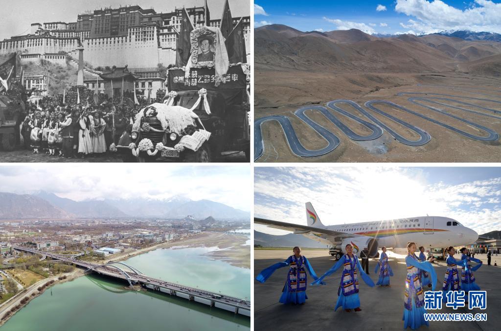 這是一張拼版照片:左上圖為1954年12月25日,康藏(今川藏)、青藏兩條公路通車儀式在布達拉宮前舉行(資料照片);左下圖為橫跨在拉薩河上的拉薩市區公路(2019年4月3日新華社記者晉美多吉攝,無人機照片);右上圖為通往珠峰的公路(2017年5月19日新華社記者 普布扎西攝);右下圖為西藏航空有限公司成立并舉行首航儀式(2011年7月26日新華社記者覺果攝)。新華社發