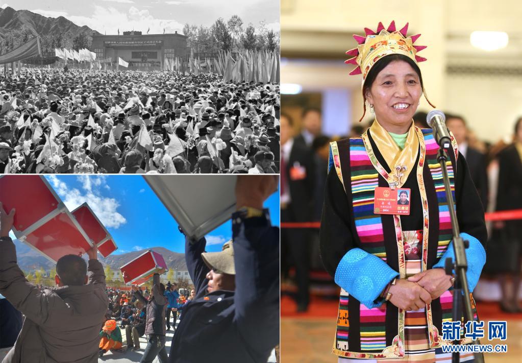 這是一張拼版照片:左上圖為1965年9月9日,拉薩各界各族人民三萬多人舉行集會游行,熱烈慶祝西藏自治區正式成立(新華社記者馬競秋攝);左下圖為拉薩市柳梧新區管委會柳梧鄉柳梧村換屆選舉工作人員展示投票箱(2014年10月29日新華社記者普布扎西攝);右圖為2018年3月11日,十三屆全國人大一次會議在北京人民大會堂舉行第三次全體會議,全國人大代表卓嘎在“代表通道”接受采訪(新華社記者金立旺攝)。新華社發