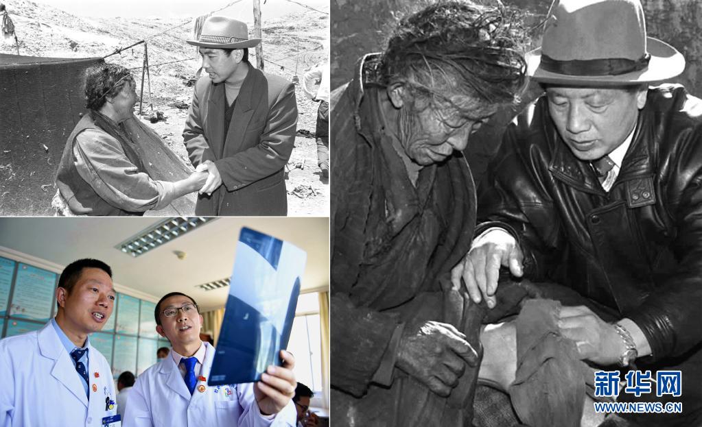 這是一張拼版照片:左上圖為來自陜西的援藏干部阿里日土縣副縣長賈冗勇深入牧區,幫助藏族牧民解決生產、生活的實際困難(新華社記者土登攝 1997年11月11日發);左下圖為2017年8月3日,北京積水潭醫院援藏醫生龔曉峰(右)和北京天壇醫院援藏醫生李家謀在拉薩市人民醫院骨科病房內查看患者的X光片,進行工作交接(新華社記者晉美多吉攝);右圖為孔繁森(右)在阿里日土縣過巴鄉為孤寡老人益西卓瑪治病(新華社記者土登攝 1994年12月26日發)。新華社發