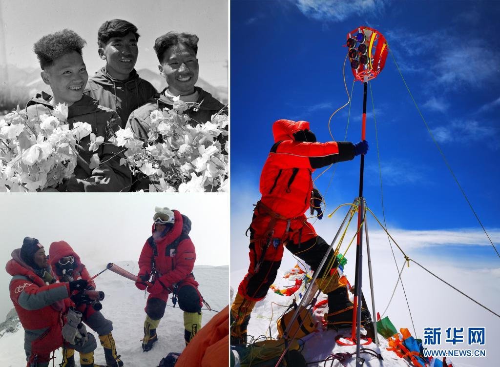 這是一張拼版照片:左上圖為1960年5月登上珠穆朗瑪峰頂的中國登山隊隊員王富洲(右)、貢布(中)和屈銀華(資料照片 新華社發);左下圖為2008年5月8日,北京奧運圣火珠峰傳遞登山隊隊員羅布占堆(左)點燃第一棒火炬手吉吉手中的“祥云”火炬(新華社發);右圖為2020珠峰高程測量登山隊隊員在珠穆朗瑪峰峰頂開展測量工作(2020年5月27日新華社特約記者扎西次仁攝)。新華社發