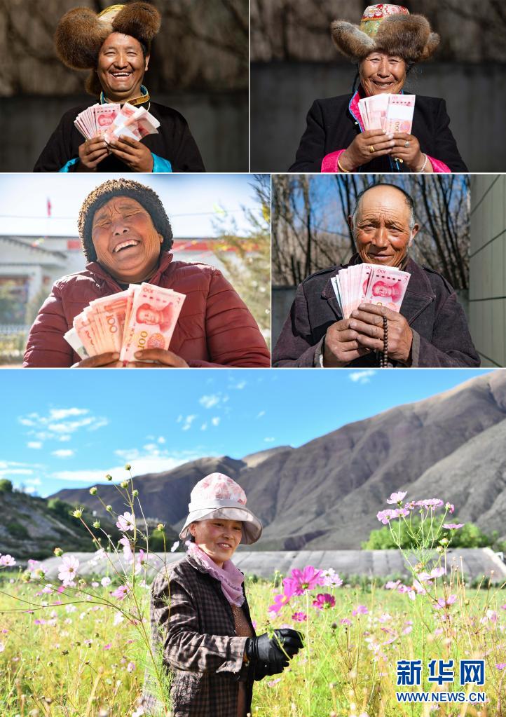 這是一張拼版照片:上四圖為2021年2月9日,山南市乃東區克松社區領到分紅的農民興高采烈(新華社記者普布扎西攝);下圖為西藏昌都市察雅縣卡貢村村民在當地苗圃產業基地采集鮮花種子,曾經的建檔立卡貧困戶在這里實現了就業,完成了脫貧(2020年9月28日 新華社記者晉美多吉攝)。新華社發