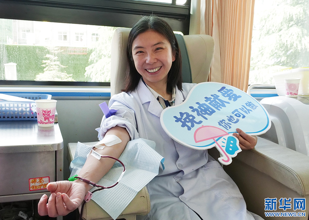 5月27日,來自北京協和醫院的援藏專家楊筱在獻血。(新華網 旦增努布攝)