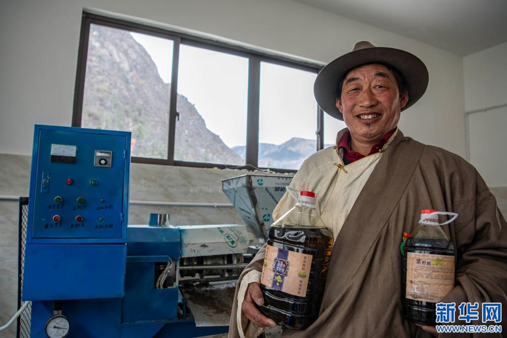 2021年3月23日,在昌都市江達縣崗托鎮崗托村的清油加工廠,永紅在展示清油產品。新華社記者 孫非 攝