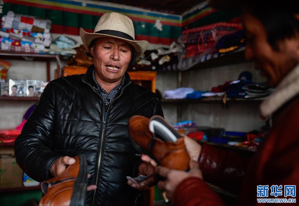 2018年3月15日,西藏阿里地區改則縣物瑪鄉搶古村村民阿祖(左)在合作社商店內銷售皮鞋。新華社發 劉東君 攝