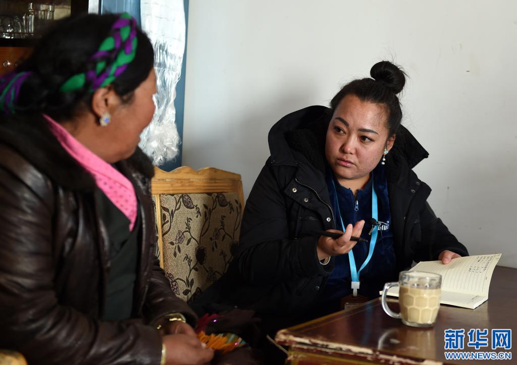 2018年3月6日,拉薩市曲水縣委宣傳部副部長、才納鄉四季吉祥村黨支部第一書記索朗央吉(右)與村民商量編制規劃。新華社記者 覺果 攝