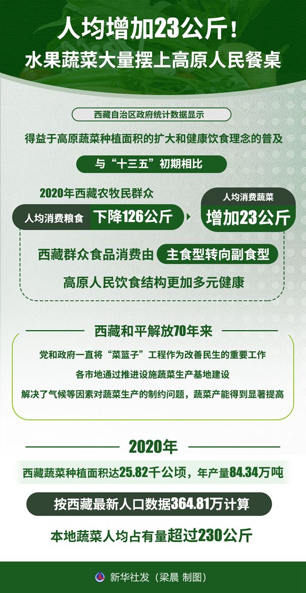 西藏自治區(qū)政府統(tǒng)計(jì)數(shù)據(jù)顯示,得益于高原蔬菜種植面積的擴(kuò)大和健康飲食理念的普及,與“十三五”初期相比,2020年西藏農(nóng)牧民群眾人均消費(fèi)糧食下降126公斤,人均消費(fèi)蔬菜增加23公斤,西藏群眾食品消費(fèi)由主食型轉(zhuǎn)向副食型,高原人民飲食結(jié)構(gòu)更加多元健康。