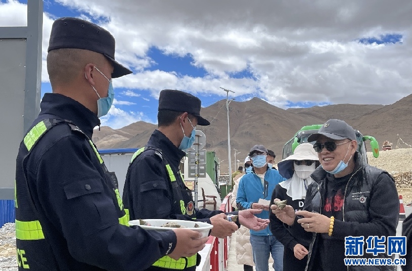 6月14日,珠峰邊境派出所的民警給游客送粽子。新華網(wǎng) 旦增努布 攝