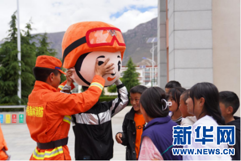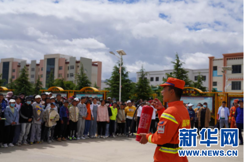 西藏森林消防總隊指戰員到西藏自治區兒童福利院教授孩子們使用滅火器(6月12日攝)。施福壽攝