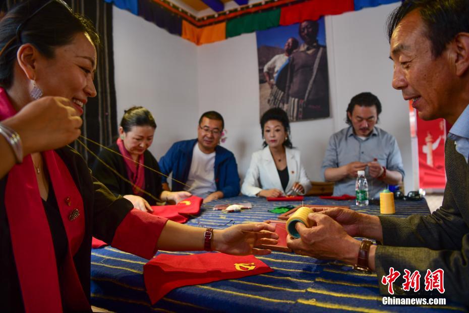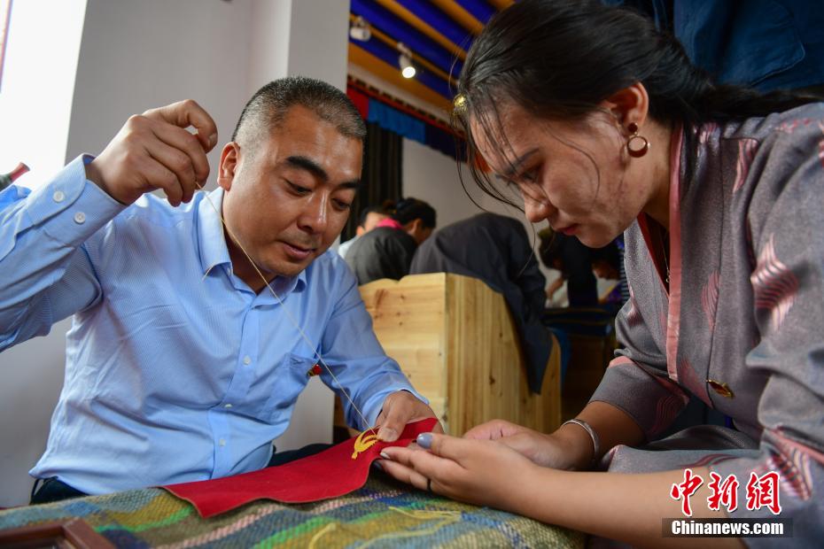 6月29日上午,西藏自治區民辦職業技能培訓學校行業黨委在拉薩市城關區開展慶祝建黨100周年活動,現場黨員們通過開展重溫入黨誓詞、縫制黨旗、走訪慰問等紀念活動,回顧黨的百年光輝歷程。圖為縫制黨旗現場。貢嘎來松 攝