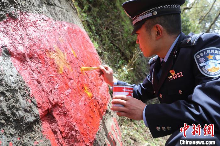 圖為玉麥邊境派出所移民管理警察在邊境一線對國旗、中國字樣等主權標志物描紅。山南邊境管理支隊供圖