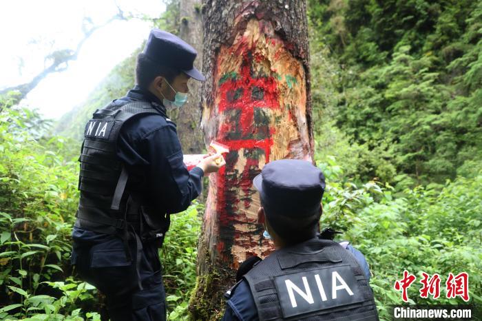 圖為三安曲林邊境派出所移民管理警察在邊境山口噴繪主權標志物。山南邊境管理支隊供圖