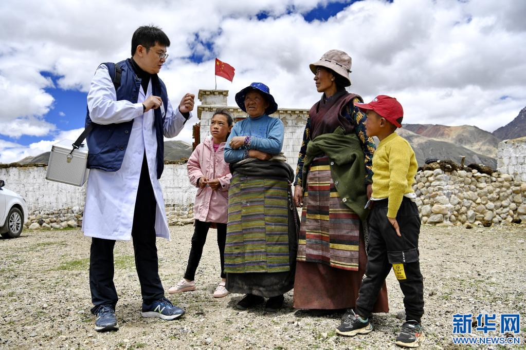 在拉薩市當雄縣格達鄉格達村,前來義診的王克明(左一)為村民講解健康知識(6月19日攝)。新華社記者 張汝鋒 攝