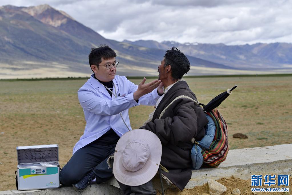 王克明(左)在西藏當雄縣格達鄉格達村牧場為牧民義診(6月19日攝)。新華社記者 張汝鋒 攝