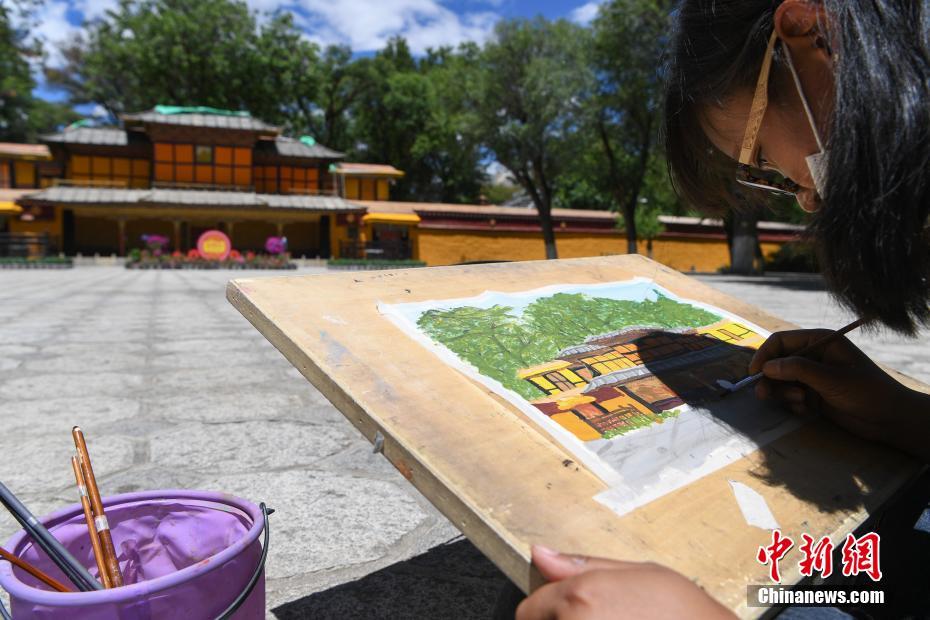 7月8日,西藏大學(xué)建筑系學(xué)生前往西藏自治區(qū)拉薩市城關(guān)區(qū)羅布林卡進行建筑美術(shù)實習(xí)。在7天的實習(xí)中,學(xué)生們將在哲蚌寺、色拉寺等地,把西藏民族特色建筑、風(fēng)景一幅幅手繪在紙上。圖為西藏大學(xué)建筑系學(xué)生手繪羅布林卡風(fēng)景。 中新社記者 貢嘎來松 攝