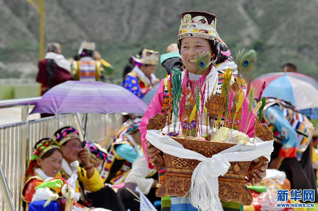 7月9日,共康村村民端著切瑪盒慶祝“望果節”。新華社記者 張汝鋒 攝