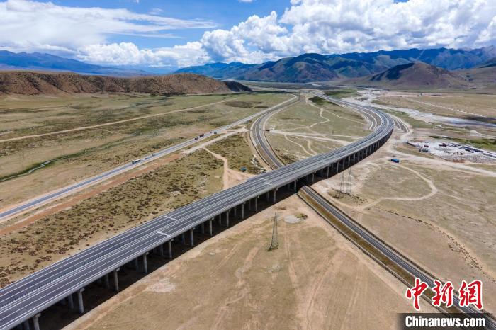 圖為航拍G6京藏高速那曲至羊八井段,目前該段高速主線已全部完成建設(shè),通車在即。 江飛波 攝