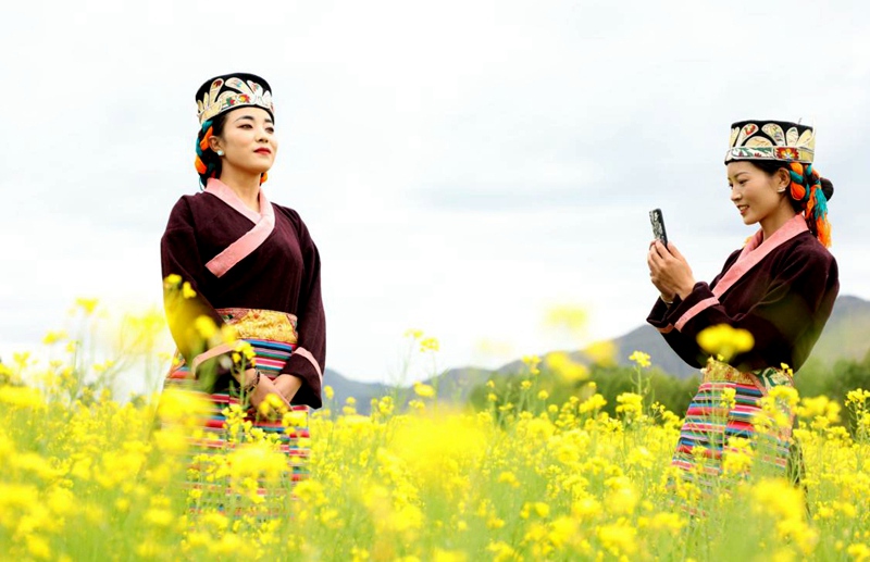 身著節日盛裝在花海中拍照。格桑倫珠攝