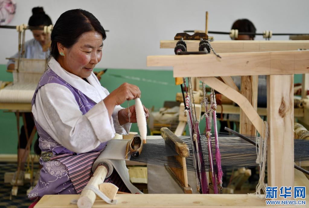 社員巴果在民族手工藝(邦典)專業合作社編織藏式圍裙邦典(2020年7月6日攝)。 新華社記者張汝鋒 攝