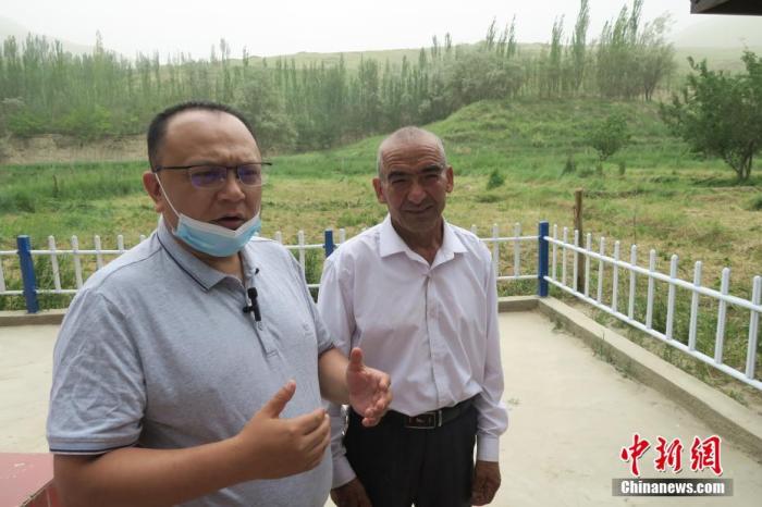 圖右為新疆維吾爾自治區(qū)和田地區(qū)于田縣普魯村村民西日普·依布地,他也是當(dāng)年先遣連見(jiàn)證者的后代。 中新社記者 楊程晨 攝