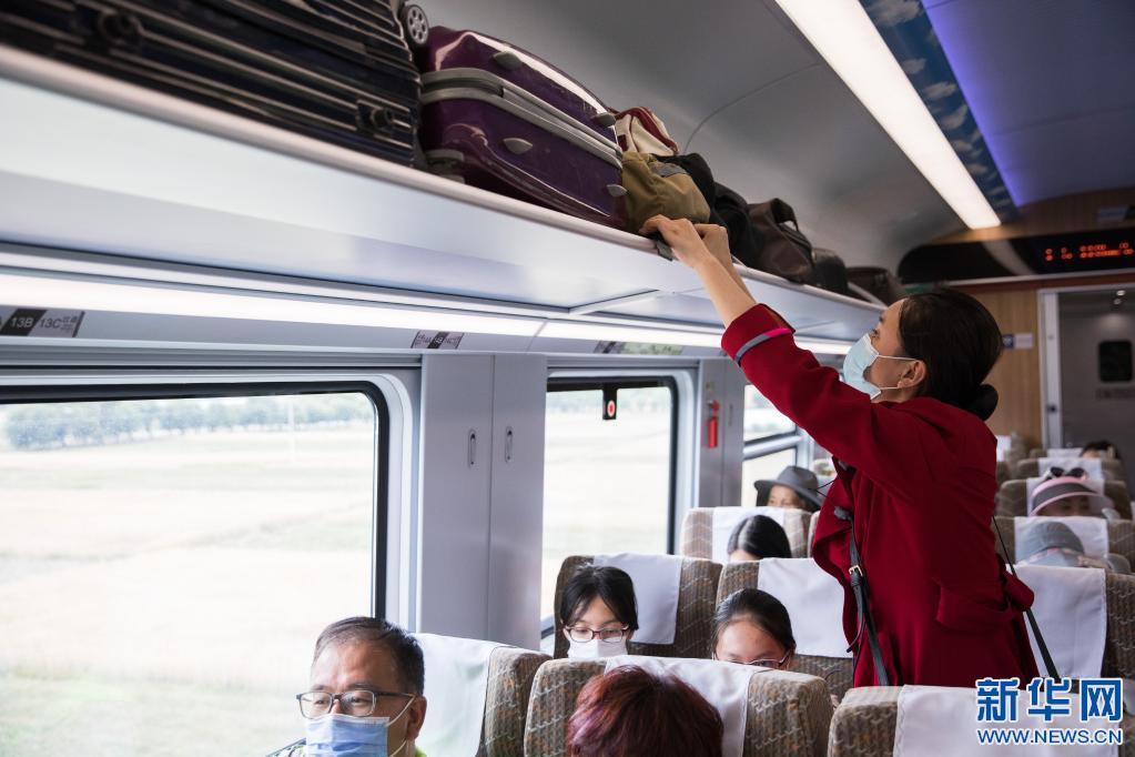 在從拉薩開往林芝的列車上,列車乘務員在整理貨架上的行李(7月26日攝)。新華社記者 金立旺 攝