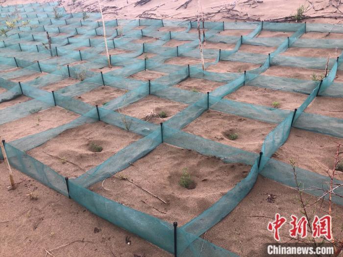 “傳統(tǒng)的方法是用廢樹枝等擺成方格等一定的形狀壓沙,里面再種上植物,效果很好但樹枝往往四五年就腐爛了;最近我們?cè)趪L試推廣一種新型化學(xué)材料方格,成規(guī)模快,且能維持七到十年。”中國(guó)科學(xué)院西北生態(tài)資源研究院研究員常學(xué)向?qū)τ浾哒f(shuō)。
