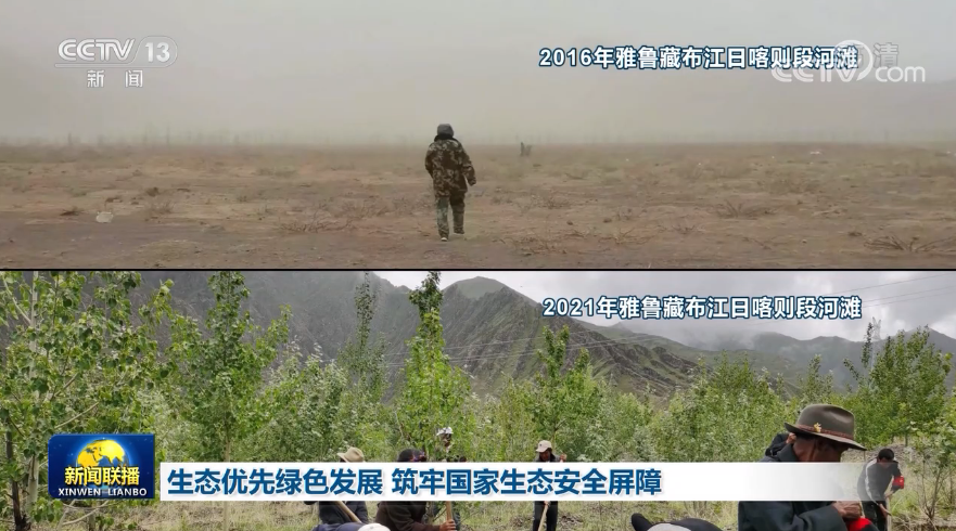 雅魯藏布江是我國(guó)最長(zhǎng)的高原河流,也被譽(yù)為西藏人民的“母親河”。而受到高原氣候、地質(zhì)等環(huán)境影響,雅江流域曾出現(xiàn)過(guò)河灘荒漠化的情況。眼前這兩張照片拍攝于雅江上游河灘的同一位置,五年的時(shí)間,荒漠變成森林,讓拍攝者次仁歐珠感慨不已。