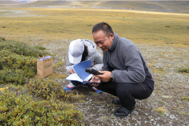 郝偉(右)和團隊工作人員在野外采集植物樣本數據。受訪者供圖