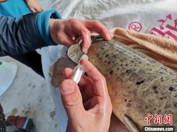 圖為多布水電站增殖放流站工作人員為魚進行人工催產。