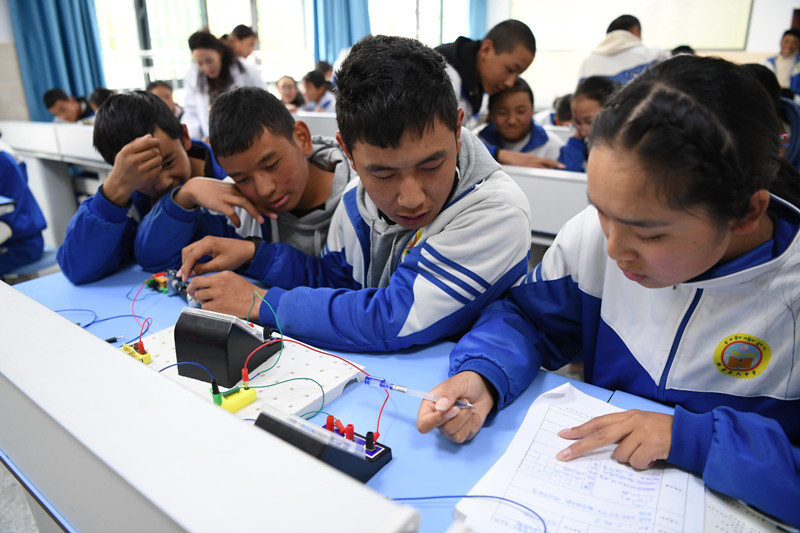 圖為拉薩市第六中學的學生們正在物理實驗室做電阻實驗。記者 唐斌 次旺 攝