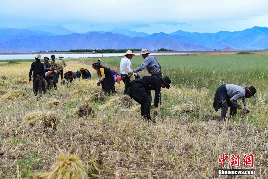 9月8日,西藏自治區拉薩市林周縣春堆鄉的農民在搶收青稞。金秋時節,拉薩河谷一帶青稞成熟,農民在青稞田忙碌,一片繁忙景象。中新社記者 貢嘎來松 攝