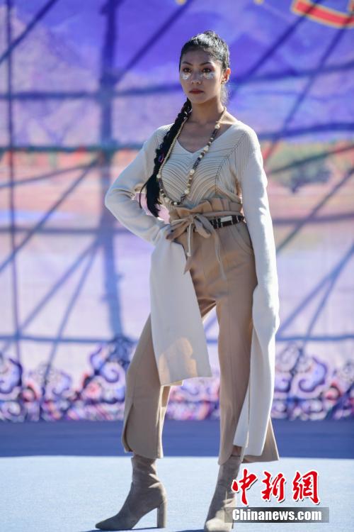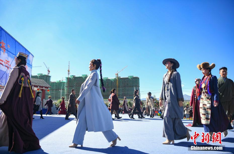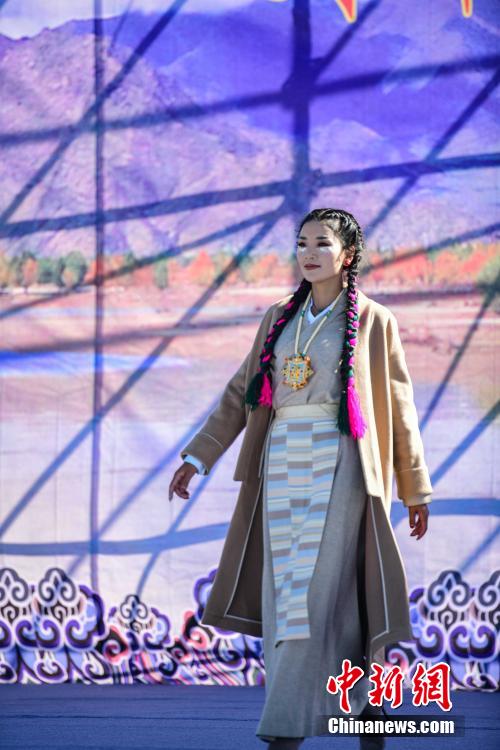 圖為當地藏族模特身著“雅魯藏布”現代藏裝服飾進行走秀。貢嘎來松 攝