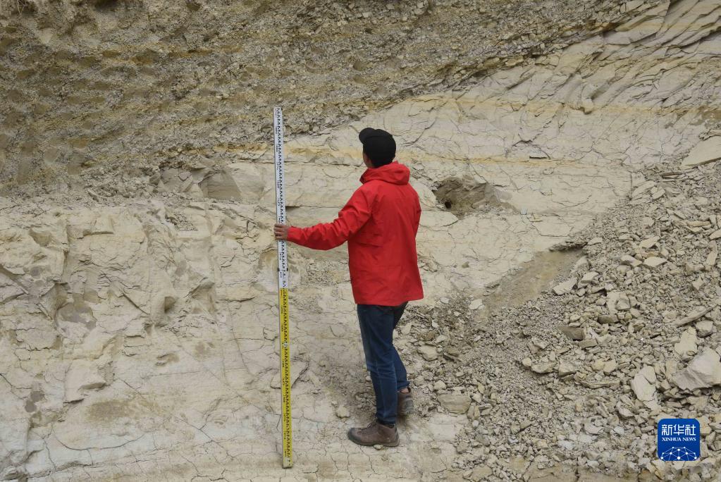 8月27日,在西藏日喀則市定結縣一處山體,科考隊員郭劍使用標尺,測量湖相沉積物厚度。新華社記者 杜剛 攝