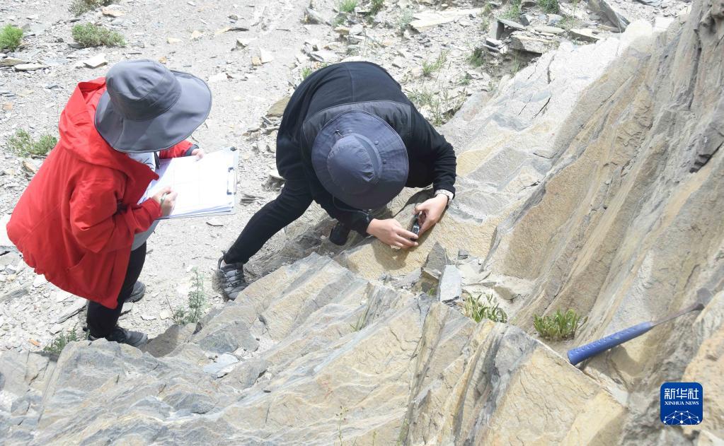 8月21日,在西藏日喀則市一處山體,科考隊員使用地質(zhì)錘、羅盤等工具,進行地質(zhì)災害鏈科考工作。新華社記者 杜剛 攝