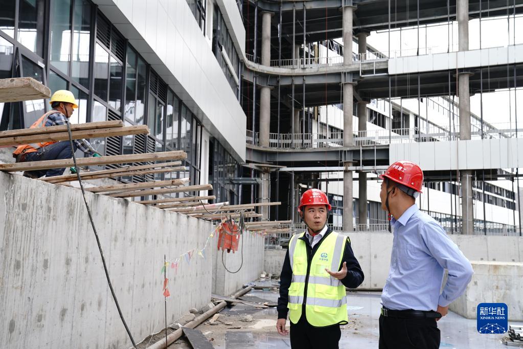 張磊正在查看項目室內(nèi)施工現(xiàn)場(2021年9月18日攝)。新華社記者 劉洪明 攝