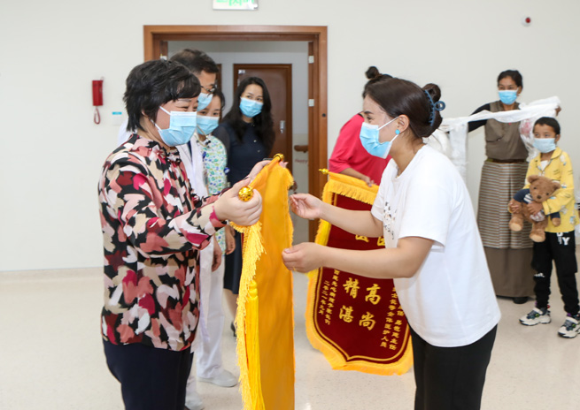 鄧?yán)蚋敝魅我恍锌赐藖碛逯委煹?5位患兒,并為他們送上嶄新的書包和文具。并與患兒家長熱情交談,詳細(xì)了解患兒恢復(fù)情況。患兒家屬代表卓瑪和旺姆分別向重慶市衛(wèi)健委和重醫(yī)附屬兒童醫(yī)院贈送了錦旗,并獻(xiàn)上了潔白的哈達(dá)表示感謝。