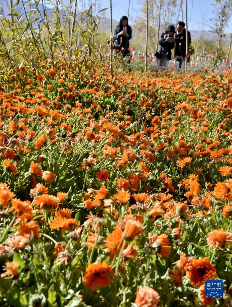 西藏阿里獅泉河鎮居民在街頭賞花(9月25日攝)。新華社發 (索朗羅布 攝)