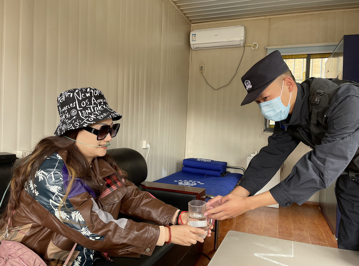 圖為曲桑邊境檢查站民警為發(fā)生高反的游客提供氧氣和熱水 鐘鑫 攝