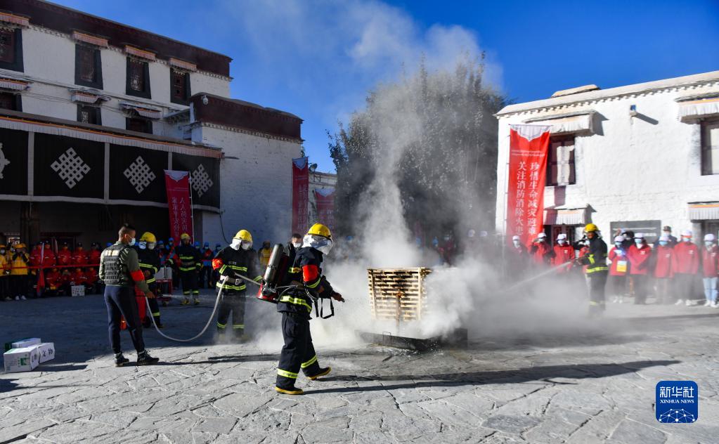 11月4日,布達(dá)拉宮管理處義務(wù)消防隊(duì)進(jìn)行消防實(shí)操演練。新華社記者 晉美多吉 攝