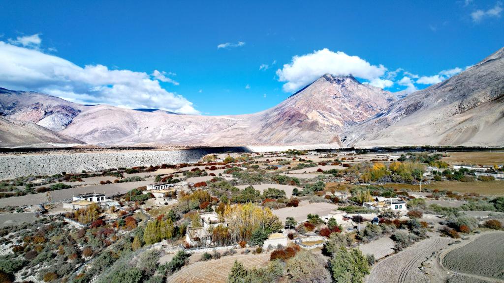 十月下旬,記者驅車來到曲當鄉(xiāng)參木達村。透過航拍中的無人機遙控器顯示屏,記者看到,藏式民居在秋色浸染的樹木映襯下錯落有致,秋日照耀下色彩斑斕,村東有巍峨的雪山、村西是奔騰南去的河流。