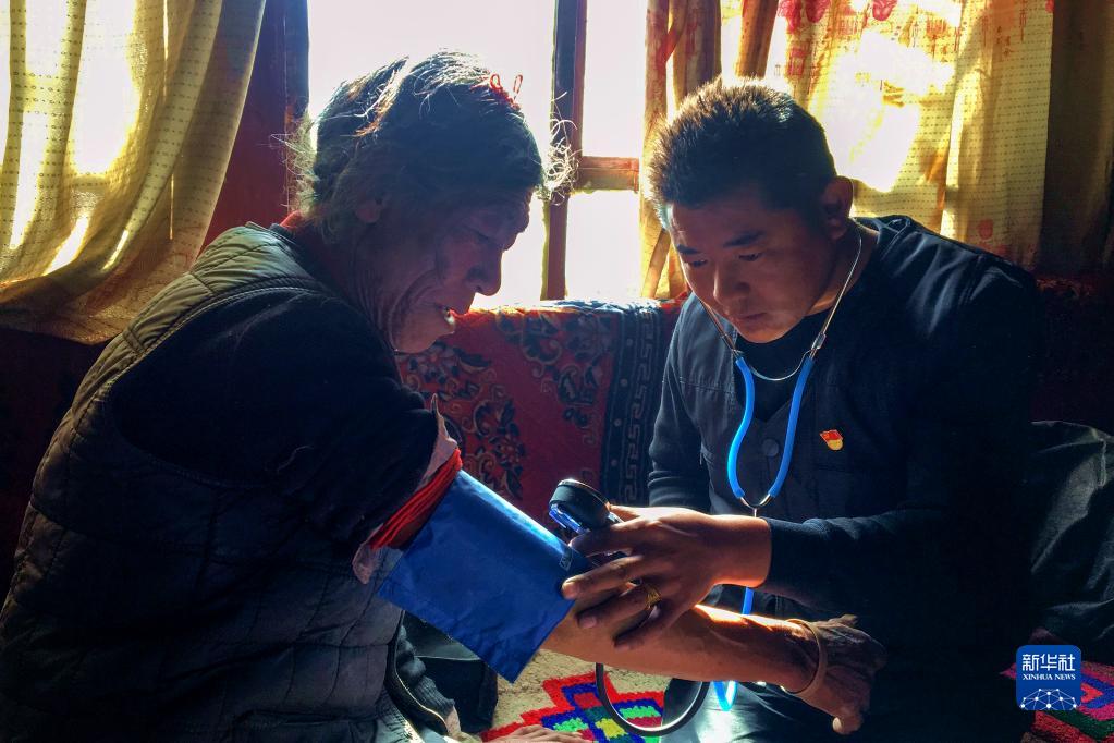 楚魯松杰鄉衛生院院長次仁頓珠(右)在給巴卡村村民索朗多杰檢查身體(2018年12月22日攝)。新華社記者 陳尚才 攝