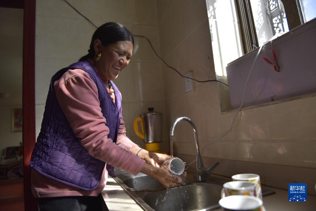 楚魯松杰鄉楚松村楚魯組村民強白桑姆用入戶自來水清洗茶碗(2021年9月18日攝)。新華社記者 格桑朗杰 攝