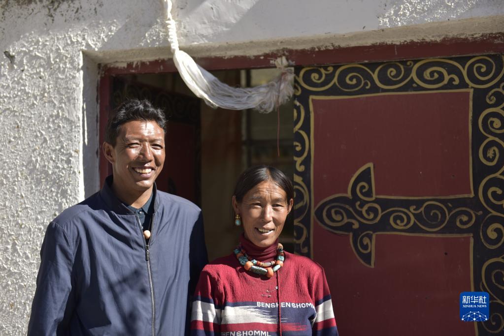 楚魯松杰鄉巴卡村巴角組村民歐珠多吉與妻子在新房門前合影(2021年9月19日攝)。新華社記者 格桑朗杰 攝