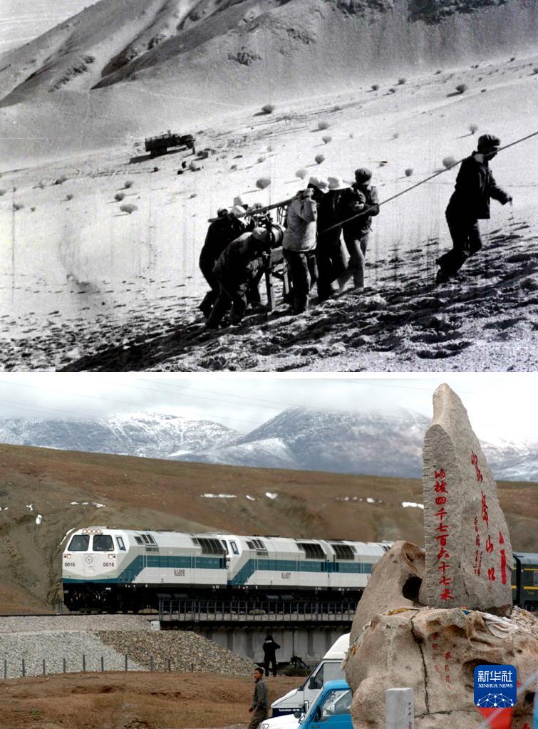 拼版照片:上圖為20世紀50年代拍攝的勘測青藏線的資料照片;下圖為2006年7月1日,青藏鐵路全線通車。這是從格爾木出發的“青1”次列車經過海拔4767米的昆侖山口(新華社記者侯德強攝)。新華社發