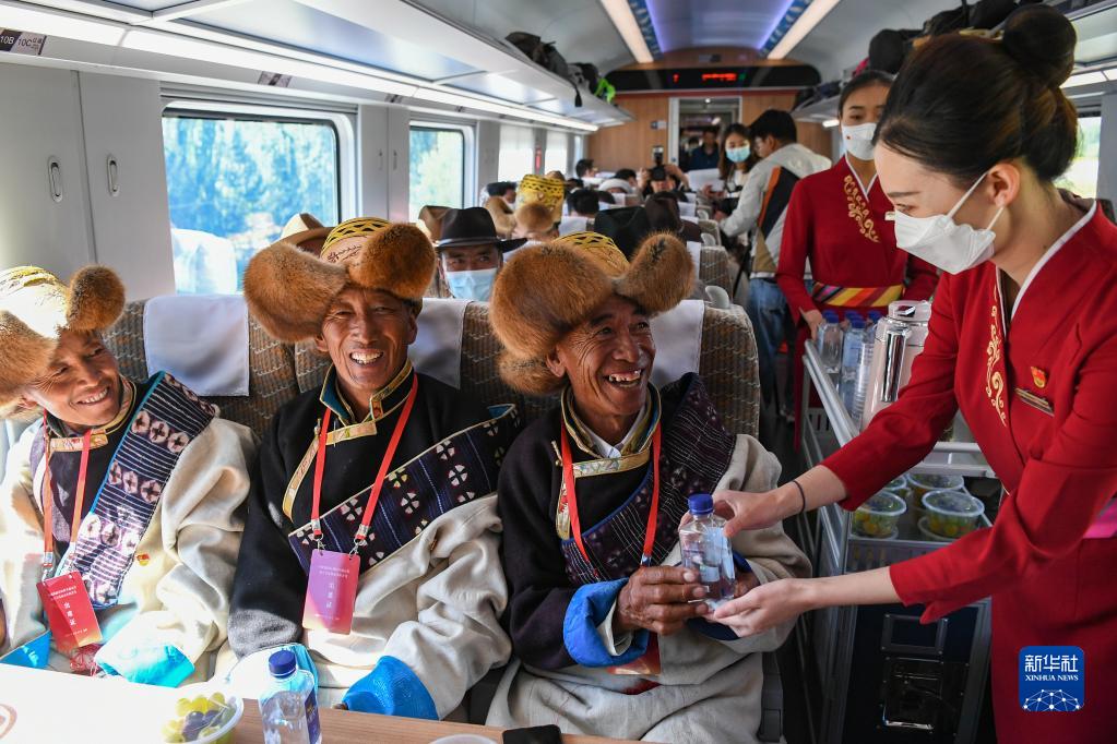 2021年6月25日,全長435公里、設計時速160公里的拉林鐵路建成通車,西藏首條電氣化鐵路建成,同時復興號實現對31個省區市全覆蓋。這是6月25日列車員向乘坐首趟復興號高原內電雙源動車組的乘客遞水。新華社記者 普布扎西 攝