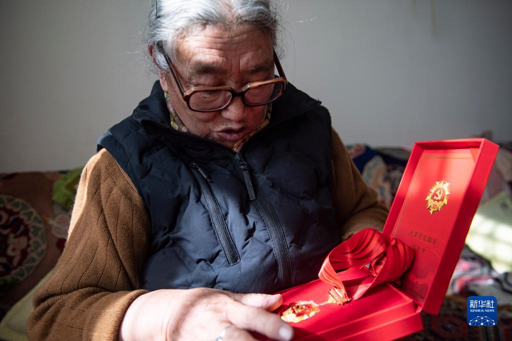 次仁卓瑪向記者展示光榮在黨50年紀念章(12月7日攝)。新華社記者 孫瑞博 攝